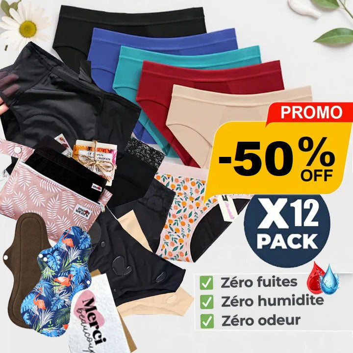 Paketet som kommer att förändra din vardag under mensen: det innehåller 12 av våra bästa modeller av menstrosor för att uppleva din mens på ett annat sätt, och en överraskning: ett oumbärligt kit GRATIS ❤️ som innehåller en tvättpåse, en förvaringspåse, en naturlig tvål och en återanvändbar binda i ekologisk bomull. Ett komplett set för att förbli elegant, bekväm och lugn under din cykel.